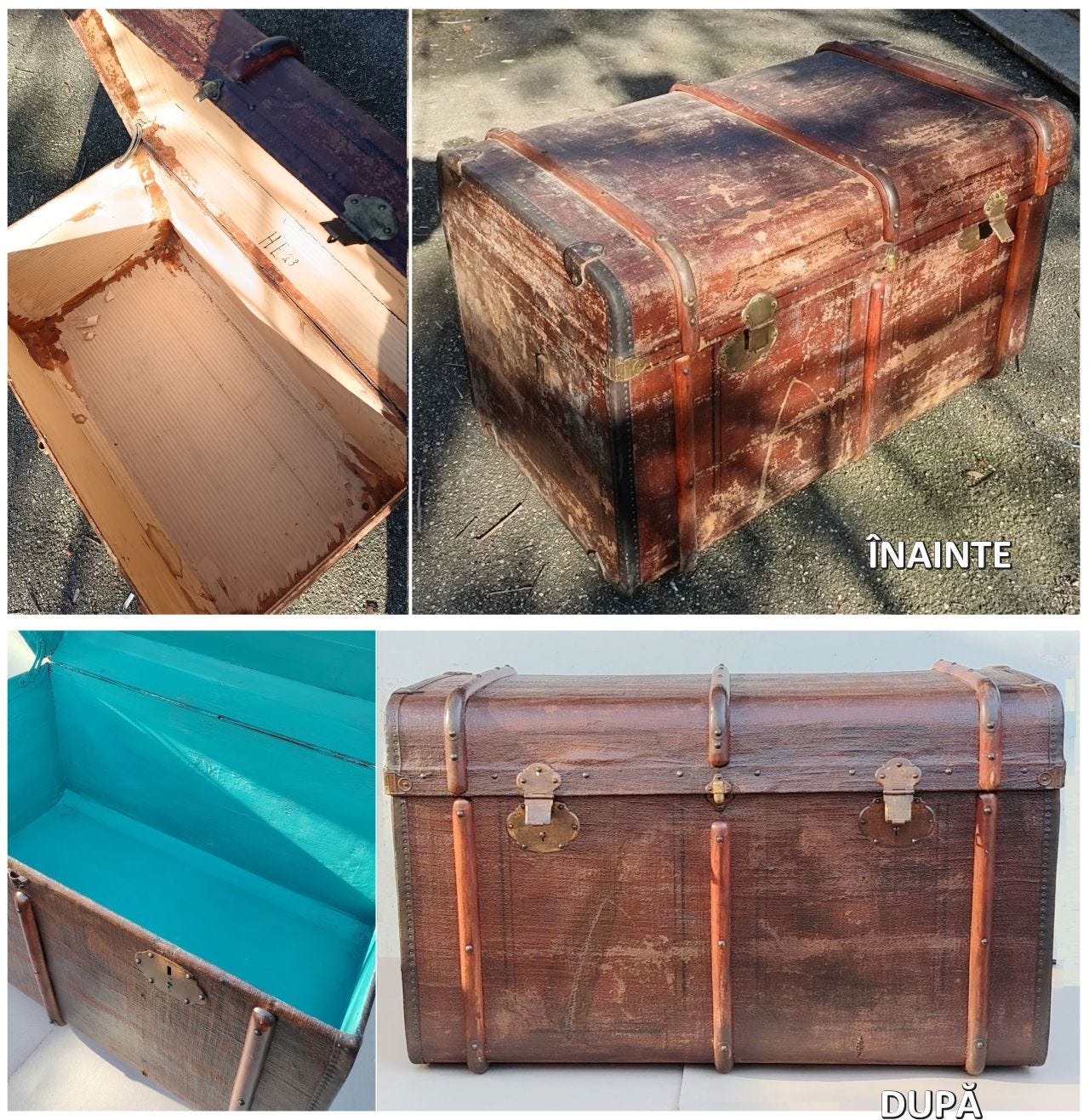 Uite și pozele cu care rămăsesem dator. Precum vezi, cufărul arată tot vechi, dar nu mai arată împuțit, abuzat sau orfan. Poate fi revopsit cu orice și se poate face orice din el, de la dulap, veioză, noptieră, măsuță, iar dacă-i dai o gaură, culcuș pentru doi câini mici sau trei pisici mari. A consumat materiale de vreo 70 de lei dacă le cumpăram și vreo 6 ore de dat din mâini, dar ca terapie anti-stres a valorat fix cât am avut nevoie.